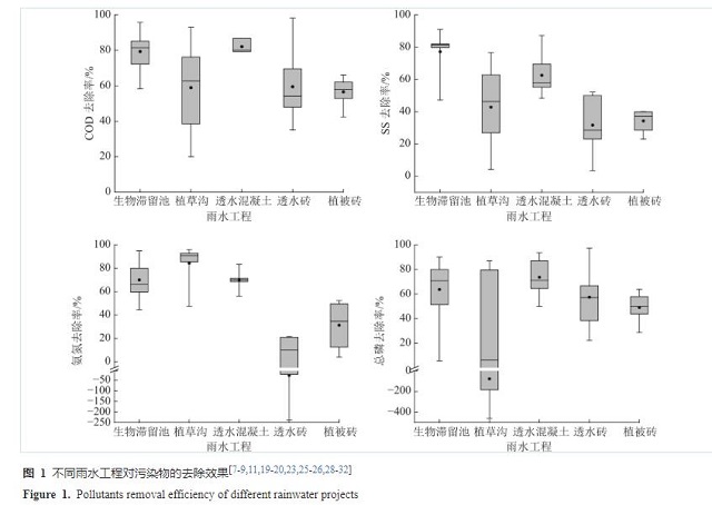 根據(jù)生物滯留池、植草溝、透水混凝土鋪裝、透水磚鋪裝和植被磚鋪裝5種雨水工程的實際監(jiān)測結(jié)果,并綜合文獻(xiàn)報道,發(fā)現(xiàn)生物滯留池和透水混凝土具有較好的污染物去除效果,植草溝對于氨氮的去除具有獨特的優(yōu)勢。植草溝的工程維護(hù),特別是植被的生長情況,對于污染物的去除率有重要影響。若植被維護(hù)不善,不僅會影響其污染物去除效果,甚至?xí)蔀橛晁廴镜脑搭^。