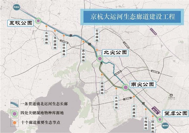 岸線全面覆綠、生態(tài)通道提質(zhì)、水岸空間重構(gòu)……明年底,通過生態(tài)廊道工程的建設,一條貫通南北運河的生態(tài)長廊將展現(xiàn)在世人面前。利用大運河的聯(lián)通性,這條綠帶上將構(gòu)建起“一廊、四源、十節(jié)點”的空間布局。4個“物種庫”源地分別為五牧公園、北尖公園、南尖公園、望虞公園,它們是濕地鳥類的天堂、濕地魚類的樂園,能展現(xiàn)濕地凈化的魅力,又集運河植物的大觀。從五牧濕地到搖車濕地,由北向南如珍珠般鑲嵌其中的10個重要生態(tài)節(jié)點,將成為運河水生生物的暫棲地,為這道絕美風景錦上添花。