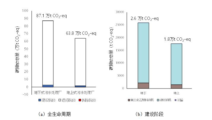 地下式污水處理廠產(chǎn)生的綜合環(huán)境與投資影響(LCCI)較同等規(guī)模與工藝的地上式污水處理廠高出21%,全生命周期碳排放較地上式高出36.5%。即使地下廠地面部分留作綠地園林景觀,所產(chǎn)生生態(tài)效益也無法抵消對環(huán)境產(chǎn)生的總的負面影響。
