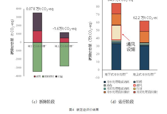 案例污水處理廠全生命周期碳足跡評價結(jié)果如圖4所示。地下廠全生命周期總碳排放量約87.1 萬t CO2-eq,較地上廠高36.5%,其中,運行階段碳排放量可達總量的95%以上。由于地下工程結(jié)構(gòu),地下廠在建設(圖6b)與拆除階段(圖6c)中,需要額外的施工量與建材消耗;在運行階段(圖6c),則需額外通風、照明等電力消耗。因此,地下廠運行階段(20年)總碳排放量較地上式高35.8%;其中,地下廠額外通風產(chǎn)生的碳排放量約18.4萬t CO2-eq,占總排放量的22%??梢?,地下式污水處理廠全生命周期中會產(chǎn)生大量碳排放,不符合碳減排、碳中和的社會發(fā)展方向。