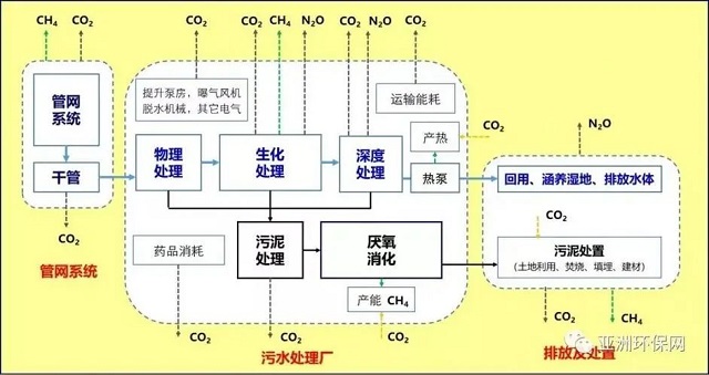 污水處理過程實(shí)際就是碳排放的過程,污水處理行業(yè)的碳排放量約占全社會(huì)總排放量的1%,在環(huán)保產(chǎn)業(yè)中占比最大。污水處理過程中會(huì)排放二氧化碳、甲烷和氧化亞氮。其中,二氧化碳主要來源于污水治理設(shè)施的能耗過程,而水污染物降解產(chǎn)生的二氧化碳則認(rèn)定為生源性碳排放;甲烷主要來源于污水處理厭氧環(huán)節(jié),包括管網(wǎng)、厭氧池、化糞池、污泥厭氧消化池等;氧化亞氮主要來源于污水處理過程的硝化反硝化階段。