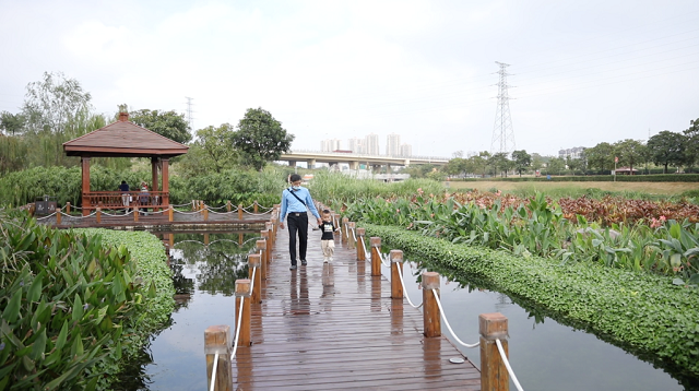 住在公園旁的市民韋如科推開窗戶,對面的百畝美人蕉開得正艷,“開窗見綠,開窗見水,開窗見花,我的花園居住夢實現(xiàn)了。”