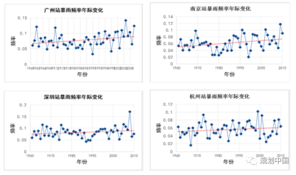 分析全國主要城市60年來的氣象數(shù)據(jù)發(fā)現(xiàn),隨著溫度升高,短歷時強降雨天氣增加,大多數(shù)城市暴雨都更多了,這是一個趨勢,增加了城市洪澇災害的風險。