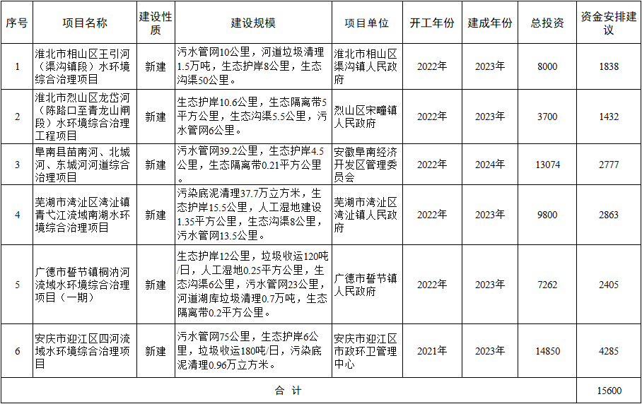 安徽省 安徽省2022年重點(diǎn)流域水環(huán)境綜合治理中央預(yù)算內(nèi)投資計(jì)劃擬安排情況公,顯示6個(gè)項(xiàng)目共獲得1.56億元資金,包括污水管網(wǎng)建設(shè)、垃圾清理、人工濕地建設(shè)等。