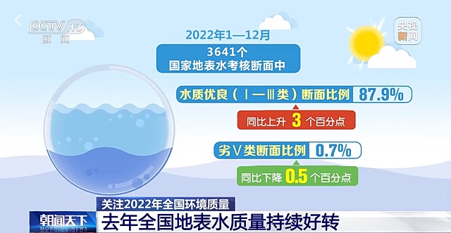 2022年1—12月,3641個(gè)國(guó)家地表水考核斷面中,水質(zhì)優(yōu)良(Ⅰ—Ⅲ類)斷面比例為87.9%,同比上升3個(gè)百分點(diǎn);劣Ⅴ類斷面比例為0.7%,同比下降0.5個(gè)百分點(diǎn)。