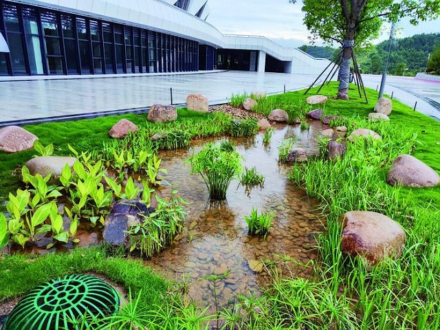 創(chuàng)新徑流組織模式,構(gòu)建地表淺溝雨水收集系統(tǒng)。項目通過優(yōu)化場地徑流組織,在現(xiàn)有排水系統(tǒng)的基礎(chǔ)上,通過線性排水溝、蓋板溝以及植草溝收集大面積硬質(zhì)鋪裝路面雨水,通過導(dǎo)引管將場地徑流從鋪裝的排水溝導(dǎo)入周邊的雨水花園,實現(xiàn)雨水徑流的滯蓄和凈化。屋面雨水通過管道收集進入末端調(diào)蓄池進行管控,削減了外排峰值流量,使生態(tài)綠地得到有效利用,為城市環(huán)境管理提供了新思路。