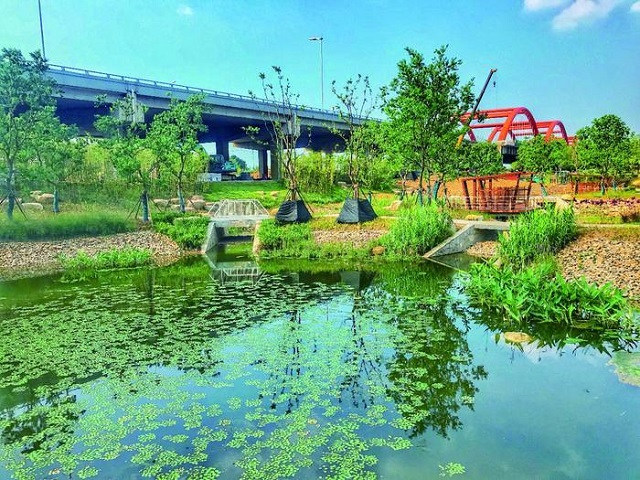 因地制宜打造生態(tài)海綿公園 作為南京市海綿公園示范啟動項目,項目從實際出發(fā),統(tǒng)籌防澇和控污,將場地豎向與周邊易澇點系統(tǒng)銜接,因地制宜建設(shè)下凹式綠地、人工濕地、雨水調(diào)蓄等綠色海綿設(shè)施,促進有機污染物在綠地內(nèi)的凈化,進一步減少河道水質(zhì)污染、提升河水透明度,同時解決了片區(qū)積淹水問題,強化了雨水綜合利用,成為燕子磯新城重要的綠色生態(tài)廊道,為周邊居民營造安全、舒適的生態(tài)休閑環(huán)境,為南京市海綿城市建設(shè)提供樣板。
