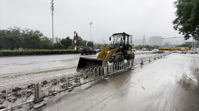 現(xiàn)場,北京環(huán)衛(wèi)集團的相關(guān)人員正抓緊對這些淤積泥沙進行清理。在公路上,大型鏟車、多功能作業(yè)利用車前的刮板,把淤泥鏟起并堆積起來,再用大型清運車輛拉走后進行沖洗作業(yè)。而在人行道上,工作人員主要通過人工作業(yè),利用鐵鍬等工具將路面清理干凈。