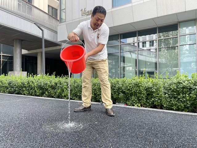 近年來(lái),透水磚、滲水路面得到廣泛使用,在石景山保險(xiǎn)產(chǎn)業(yè)園也同樣如此。園區(qū)暖通工程師那會(huì)義向記者展示了路面滲水試驗(yàn)。那會(huì)義拎來(lái)一大桶水, 沖著路面倒了下去。記者看到,雖然水流流速很快,但路面就像干燥的海綿,可以把水快速吸干,一點(diǎn)兒積水都沒(méi)有。