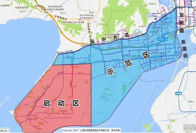 臨湖片區(qū)高品質(zhì)供水啟動(dòng)區(qū)位于吳中區(qū)西側(cè),毗鄰太湖,北至東太湖路,南至大缺港,東至東山大道,西至環(huán)太湖路,總面積約54平方公里,共包含44個(gè)小區(qū),12個(gè)行政村,目前服務(wù)人口數(shù)量約為10萬人。該片區(qū)飲用水主要由吳中新水廠供給,供水規(guī)模約2.5萬m3/天。