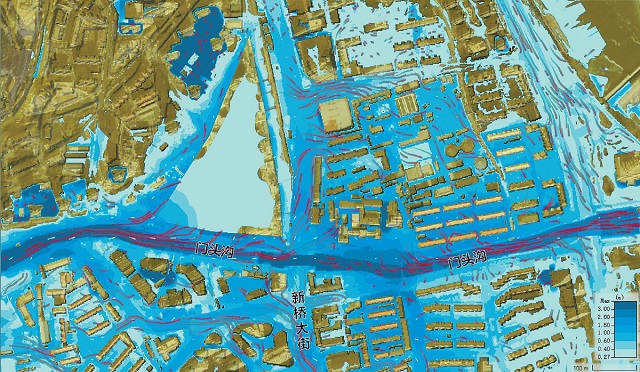 以受災(zāi)較嚴(yán)重的門頭溝和中門寺溝兩個(gè)流域?yàn)槔?月1日雨勢減小后,工作組即刻到山洪沖擊地區(qū)進(jìn)行現(xiàn)場調(diào)研,收集實(shí)地洪水排泄及淹沒資料;8月4日開始搭建洪水反演模擬模型,經(jīng)過近20次的驗(yàn)證調(diào)試,模擬結(jié)果基本符合實(shí)際。經(jīng)過驗(yàn)證的模型,可以模擬不同降雨條件下洪水和城市內(nèi)澇的淹沒情況,為災(zāi)后恢復(fù)重建、長遠(yuǎn)高質(zhì)量發(fā)展提供決策支持。