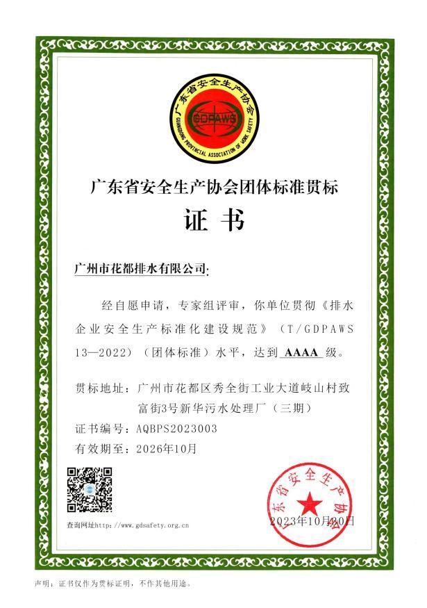 廣州水投花都排水公司獲得排水企業(yè)安全生產(chǎn)標(biāo)準(zhǔn)化AAAA級證書