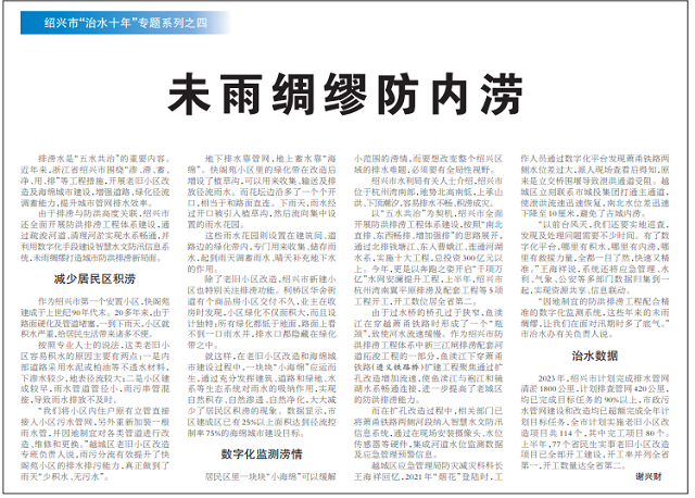 排澇水是“五水共治”的重要內(nèi)容。近年來,浙江省紹興市圍繞“滲、滯、蓄、凈、用、排”等工程措施,開展老舊小區(qū)改造及海綿城市建設(shè),增強道路、綠化徑流調(diào)蓄能力,提升城市管網(wǎng)排水效率。