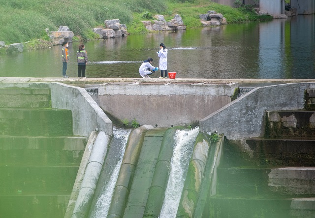 生態(tài)環(huán)境工作人員在江北區(qū)溉瀾溪入江口開(kāi)展水質(zhì)監(jiān)測(cè)。張錦輝攝