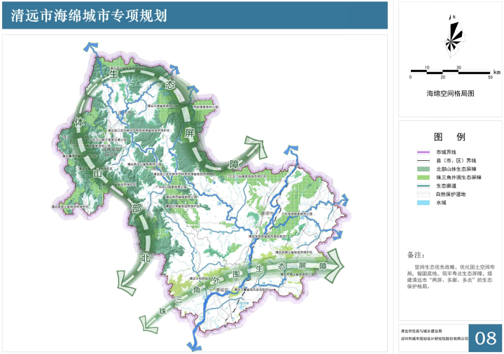 根據(jù)《規(guī)劃》,清遠(yuǎn)將構(gòu)建“兩屏、多廊、多點(diǎn)”的海綿生態(tài)空間格局?!皟善痢奔幢辈凯h(huán)形生態(tài)屏障和珠三角外圍生態(tài)屏障。強(qiáng)化與周邊連綿山體的空間銜接和協(xié)同治理,推進(jìn)南嶺、筆架山、三桂山等山體屏障的生物多樣性保護(hù)、水土保持及水源涵養(yǎng),筑牢生態(tài)安全屏障,以限制城鎮(zhèn)建設(shè)無序擴(kuò)張。生態(tài)屏障內(nèi)限制開發(fā)建設(shè)行為,針對(duì)連接屏障之間的耕地、城鎮(zhèn)等用地進(jìn)行嚴(yán)格管控,禁止破壞生態(tài)安全的活動(dòng),保障屏障的連續(xù)性和生態(tài)安全格局的完整性。