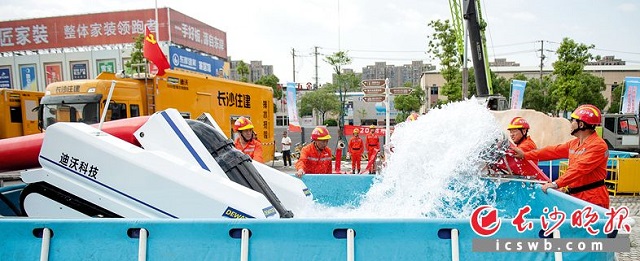 因雨勢加大,某地鐵站出現(xiàn)內(nèi)澇,嚴重影響地鐵運行安全。市城區(qū)防辦緊急調(diào)度防澇排漬搶險隊一輛高揚程排水搶險車趕赴現(xiàn)場處置……不必擔心,這驚險的一幕,只是2024年長沙市城區(qū)應對超強降雨防澇排漬聯(lián)合應急演練中的場景。5月15日,在隆平水稻博物館前坪,共有11支搶險隊伍、135人參加演練。一小時能吸干兩個泳池的超級吸水“牛魔王”5000型子母式大流量排水搶險車、排水揚程超過15層樓高的900型高揚程排水搶險車等排水“超級”裝備紛紛亮相、大顯身手。