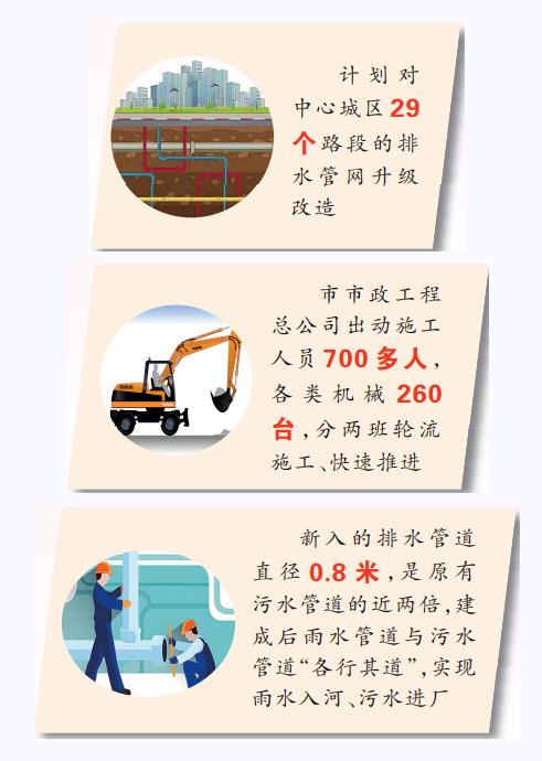 一個個項目相繼完工,深埋于城市地下的“毛細血管”逐漸發(fā)達。目前,我市已完成七一路(車站路至文化路段)、建設路(人民路至明山路段)等8個路段的排水防澇施工改造。正在對北京大道、武侯路、工業(yè)路、車站路等13個路段進行施工,這13個路段全部為雨污水未分流路段。通過本次施工改造,將進一步優(yōu)化排水系統(tǒng),有效提升中心城區(qū)排水防澇能力,減輕雨天污水處理廠壓力。