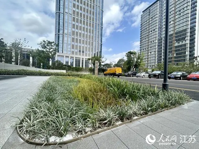 走進(jìn)揚(yáng)州建工科技園內(nèi)的綠地,會(huì)發(fā)現(xiàn)一些高出植物的黑色噴頭,這是與雨水回收系統(tǒng)聯(lián)動(dòng)的自動(dòng)灌溉系統(tǒng)。這塊吸滿了水的大“海綿”,不僅可以緩解城市熱島效應(yīng),增加地塊的生態(tài)調(diào)蓄功能,還將滯留和凈化后的雨水用于園區(qū)綠化澆灌和道路噴灑。