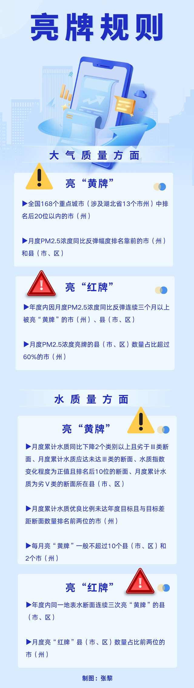 具體而言,大氣質(zhì)量方面,對(duì)全國(guó)168個(gè)重點(diǎn)城市(涉及湖北省13個(gè)市州)中排名后20位以?xún)?nèi)的市(州)亮“黃牌”;年度內(nèi)因月度PM2.5濃度同比反彈連續(xù)3個(gè)月以上被亮“黃牌”的市(州)、縣(市、區(qū)),將亮“紅牌”。