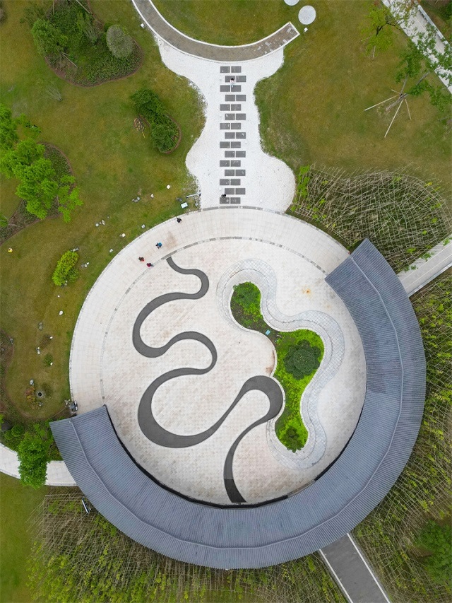 來(lái)到文博公園山頂,圓弧形風(fēng)雨連廊形成一個(gè)圈,圈里是“海綿+文化”的巧妙融合而形成的標(biāo)志性景點(diǎn)——曲水流觴。風(fēng)雨連廊房頂斜坡的雨水,從屋檐滴落到碎石帶上,經(jīng)過(guò)消能、凈化后,匯入蓄水池。