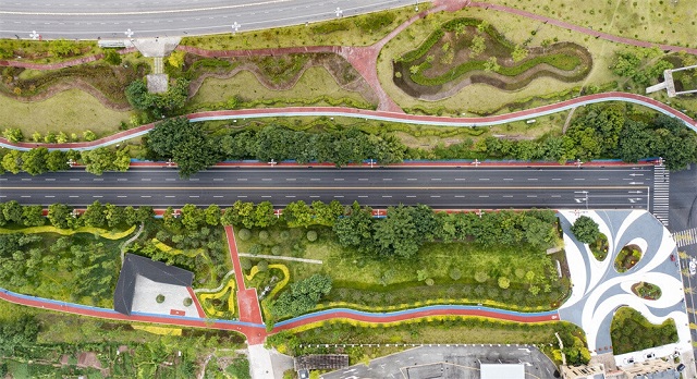 而今,大家口中的“濺水路”,在海綿城市建設(shè)中得以“翻新”“走紅”。從無(wú)人機(jī)視角俯瞰,現(xiàn)在的會(huì)展街好似一條“彩虹路”,車輛雙向四車道上通行有序,行人在五彩游步道上觀美景、嗅花香。