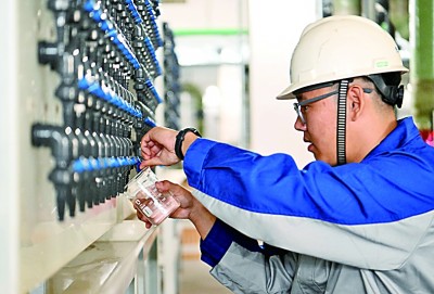 天津南港工業(yè)區(qū)一海水淡化主裝置生產(chǎn)車間內(nèi),工作人員在取樣淡水。新華社發(fā)
