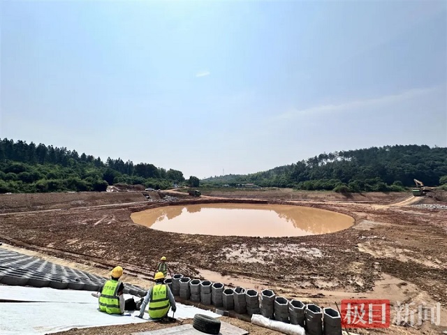 5月27日上午,楊下調(diào)蓄池建設(shè)現(xiàn)場(chǎng)的施工氛圍與天氣一樣火熱。在3號(hào)調(diào)蓄池建設(shè)現(xiàn)場(chǎng),主體結(jié)構(gòu)已完工,工人們正在進(jìn)行護(hù)坡施工。極目新聞?dòng)浾攥F(xiàn)場(chǎng)看到,該調(diào)蓄池位于一處丘陵地帶的低洼處,承接周邊大片山地、丘陵來(lái)水。調(diào)蓄池不僅能調(diào)蓄洪水,日常則可以作為灌溉水庫(kù),為下游數(shù)百畝田地提供灌溉水源。