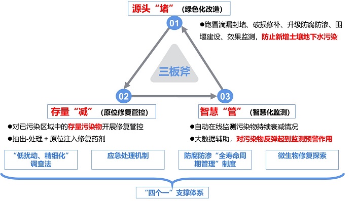 圖為忠信化工“三板斧”土壤和地下水污染源頭管控和風(fēng)險防控技術(shù)體系。