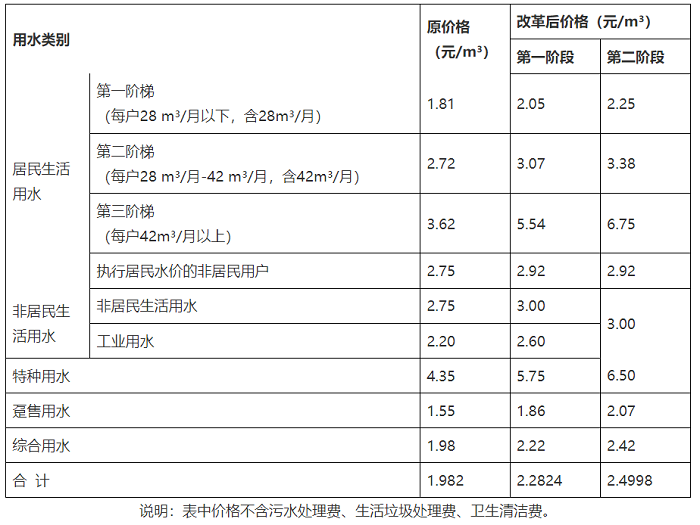 注:調(diào)整后的各類供水價格,均不包含水資源稅(0.05元/立方米)、污水處理費(居民用水0.95元/立方米,非居和特種用水1.4元/立方米)、垃圾處理費(居民:7元戶/月)。