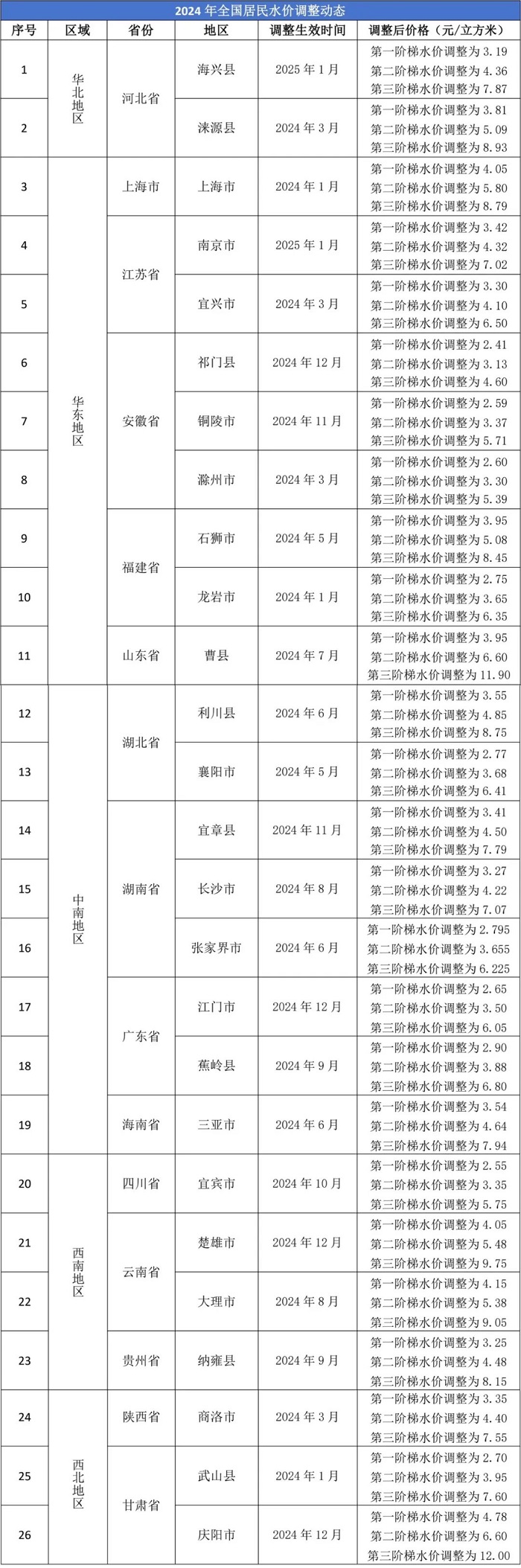 【附】2024年調(diào)整水價的城市匯總(數(shù)據(jù)來自“水務(wù)加”微信公眾號):