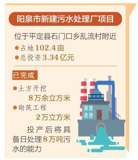 該項目位于平定縣石門口鄉(xiāng)亂流村附近,占地102.4畝,總投資3.34億元,于去年5月正式開工建設。項目由陽泉市城市管理局負責實施,山西澤陽污水凈化有限公司承擔建設及建成后的運行維護工作。